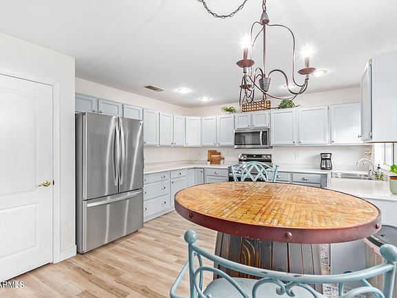 de sac. This residence boasts a sophisticated and neutral palette that allows light in every corner. In 2021, new flooring was installed throughout elevating the home's aesthetic. The spacious eat-in kitchen has updated stainless steel appliances, promising culinary adventures and cherished family gatherings. Your great room seamlessly blends living and dining spaces, creating a warm and inviting atmosphere for entertaining guests or enjoying quality time with loved ones.