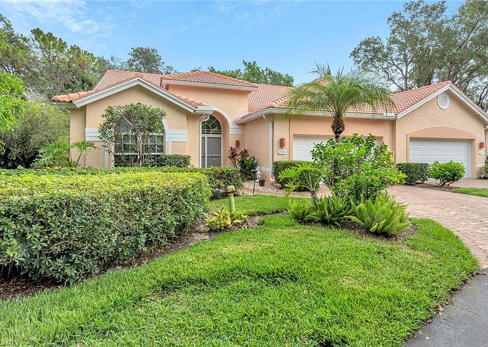 V10364. Welcome to 15200 Storrington Place in Bay Forest. This rarely available attached Villa boasts a spacious open floor plan. It consists of three bedrooms, two bathrooms, a living room, an eat in kitchen, a two-car garage, and an enormous lanai, perfect for entertaining. The spacious master bedroom features hardwood flooring, cathedral ceilings, a walk-in closet, and an oversized private bath with dual vanity sinks and a walk-in shower. Bay Forest's pristine grounds include over 2 miles of paved trails through a preserve that runs parallel with the back bay. The grounds also feature a clubhouse, fitness center, library, shuffleboard, pickleball, tennis, and bocce courts! This friendly community is close to Barefoot Beach and Delnor-Wiggins Pass State Park. Its convenient North Naples location is just minutes from Mercato’s shopping / restaurant district and a short drive downtown to 5th Avenue and 3rd Street’s vibrant nightlife, shops, and restaurants.