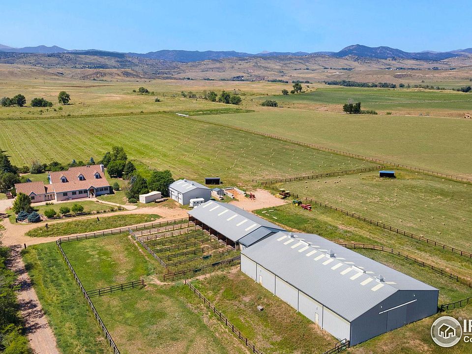 Now offered below recent appraised value!! This prime equestrian estate of nearly 35 acres is completely surrounded by 1200 acres of conservation easement land. The unobstructed views of Meeker & Longs Peak will be yours to enjoy! Ride your horses year round in the 90x120ft indoor arena with open clear span roofline, insulation, lights, and skylights. Stable your herd in the 8-stall barn with seven 14x16ft stalls and one 16x20ft stall, each with a covered area and 60ft run. Heated office, tack room, and feed room. Cement alley with mats with a hot water wash rack! 3 loafing sheds and acreage dedicated to hay production with water rights will ensure you have what it takes to have a happy herd. A large shop with 3 automatic garage doors, concrete floor, insulated ceiling, and electricity. Outstanding home features include a travertine tiled sunroom, a library with built in shelving and fireplace, a breathtaking formal dining space with crystal chandelier, walkout basement and a massive vaulted primary suite on the uppermost level with wood floors, reading nook, two walk in closets, and a luxurious bathroom retreat featuring a huge steam shower, and a jacuzzi tub overlooking Meeker and Longs Peak. A Trex deck overlooks the landscaped yard and unobstructed views of the mountains. This home boasts a durable and low-maintenance stone-coated steel roof, offering longevity, energy efficiency, and resilience against the elements.