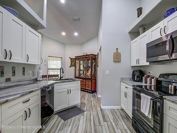 This 2019 built home sits on a very private, secluded lot next to the new 20 acre blueberry patch. Peacefullness awaits you in this custom built home. When entering this 3 bedroom 2 bath home you see quality throughout. Starting with vaulted ceilings, an open concept split floor plan, with porcelain tile floors you truly appreciate the view to the large screened lanai overlooking the private backyard. The Owner's suite is large with tray ceiling, a sliding glass door to the lanai with the owner's bath having dual sinks, a large shower and a walk-in closet and linen closet. The kitchen is equipped with Stainless steel appliances, lots of granite counter space, a breakfast bar and an ample amount of soft closed cabinetry, There are 2 guest bedrooms with large closets for all your storage needs, a laundry room off of the 2 car garage, and the guest bathroom has a door to the lanai for enjoying this beautiful space and peaceful paradise. There is an uncovered patio at the rear of the home for all your grilling needs. This home truly is a land lover's dream, all of this and still a short drive to shopping, restaurants, hospitals, etc. Welcome to Weeki Wachee Brooksville area home of the mermaids, a short drive to Pine Island and the Gulf of Mexico. Come and take a peak of this 5 year new home. An easy 45 minute commute to Tampa or head north to Crystal River. Start living the Florida lifestyle right here in the Nature's Coast.