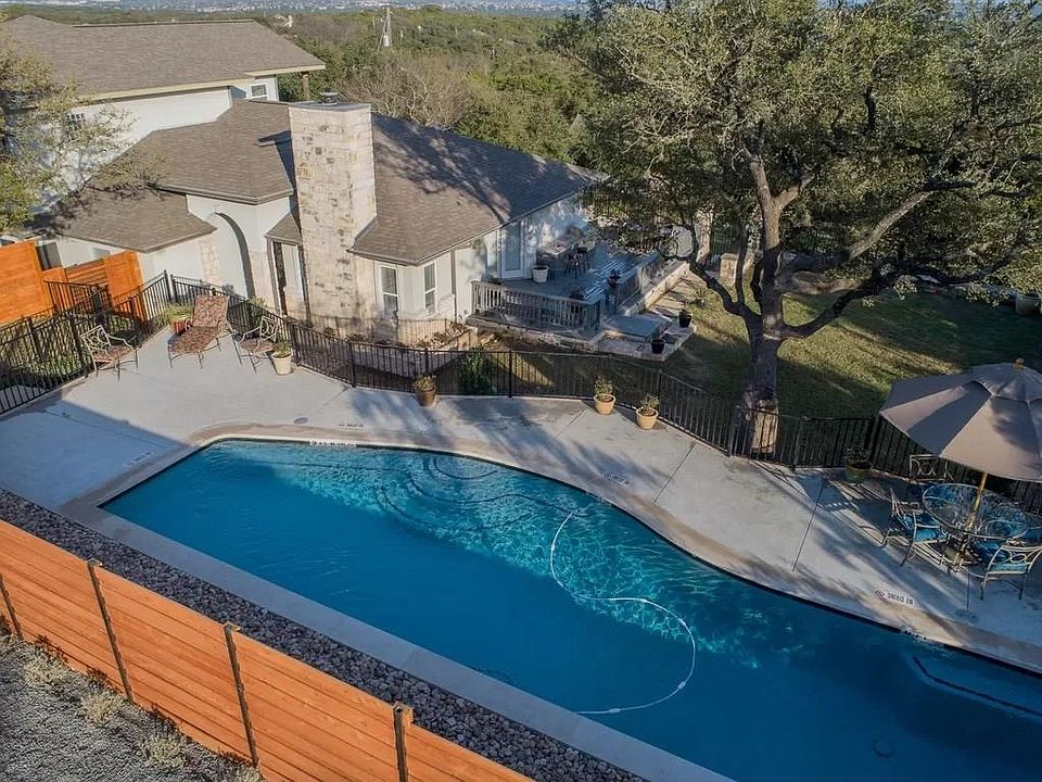 Rare Opportunity~Entertaining Multi Generational Home~Footage Includes "Hotel Style" 3 Br/Liv/1Bath attached Studio~ Plus 4 bedroom home w/ upper Gameroom and Wet Bar~Fun Ammenities include~Courtyard Entry~Sunny Heated Pool w/Wrapping Tree Shade Area~Hill Country View from Deck/Pool/Hot Tub/Upper Balcony & Liv Area~Large Fc Private Yard~Deck w/built in Grill/Sink/Cooking Counter~Built in Gas Fire Pit~Hot Tub~Inside Main Home is 3BR/2Ba down~1Br/1.5 Ba UP~Plus 3/1 Studio down.Mostly hard surface flooring