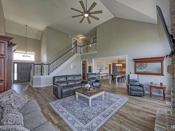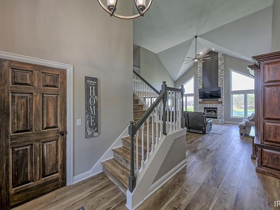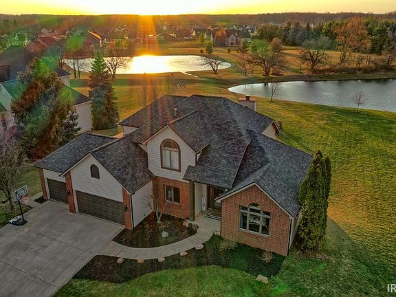 Stunning new listing in the desirable Lionsgate Passage in the sought after Leo school district. Situated on a tranquil pond lot with over half an acre of land, this home offers ample storage and space with over 4,100 finished square feet. Upstairs boasts two nice sized bedrooms and a full bath. The main level features soaring ceilings, a beautiful floor-to-ceiling wood-burning brick fireplace, a spacious primary suite, a large eat-in kitchen overlooking breathtaking views of the pond, a den with built-in cabinets, making it a versatile space for even an office. The full basement has ample storage, a full bedroom and a large wet bar. This home has been meticulously maintained and updated. Recent renovations include new roof, gutters, mostly new flooring, fresh paint inside and out and all new HVAC. Don't miss out on this incredible opportunity!