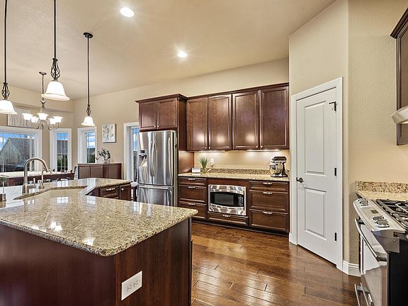 Executive Craftsmen style home. A warm inviting open concept. A kitchen you always wanted. SSappliances, Cherry finished cabinets w/lighting. Granite countertop, snackbar, pantry and wood floor. Patio door to a large deck. Great room w/high efficiency fireplace. 1st floor Master suite,Whirpool tub,shower,heated tile. Walk-out basement, 9' ceilings, full windows, stubbed for 3rd Bath. waiting for your finishing touches. Fenced Yard. Sprinker system. Several fruit trees.