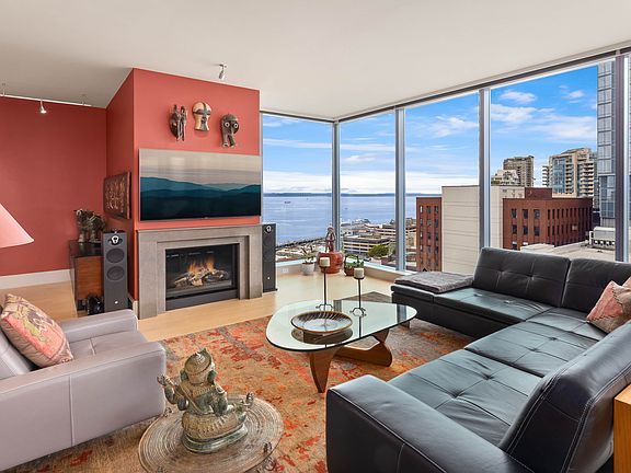 Corner residence with grand entertaining living room with views of Elliott Bay, Olympic Mountains, Seattle waterfront and city skyline - it's a treasure. Endless entertainment with sailboat regattas and Pike Place Market. This home has art gallery entry, epicurean kitchen wit Wolf, Subzero ad Miele appliances. Not to be missed - large pantry, luxurious primary suite, spa bathroom, Toto tub, motorized blinds. Just steps from Pike Place Market, Benaroya, stadiums, the arts, retail and Sculpture Park. Concierge 24/7, Walkscore 99 and two blocks to light rail. Rooftop terraces, gardens, BBQ, gym, yoga studio boardroom, sky lounge. Included: gas, water, sewer, garbage, EV parking.