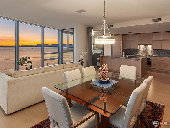 SW corner residence with grand entertaining living room with views of Elliott Bay, Olympic Mountains, Seattle waterfront, Mount Rainer and city skyline - it's a treasure. Endless entertainment the Ferris wheel, stadiums, sailboat regattas and Pike Place Market. This home has art gallery entry, epicurean kitchen with Wolf, Subzero and Miele appliances. Primary suite with water view, spa bathroom, Toto tub with water view, motorized blinds, office, wine cooler, private storage, two large parking spaces & EV charging. Just steps from Pike Place Market, Benaroya, stadiums, the arts, retail & Sculpture Park. Concierge 24/7, Walkscore 99 & two blocks to light rail. Rooftop terraces, gardens, BBQ, gym, yoga studio, boardroom, sky lounge.