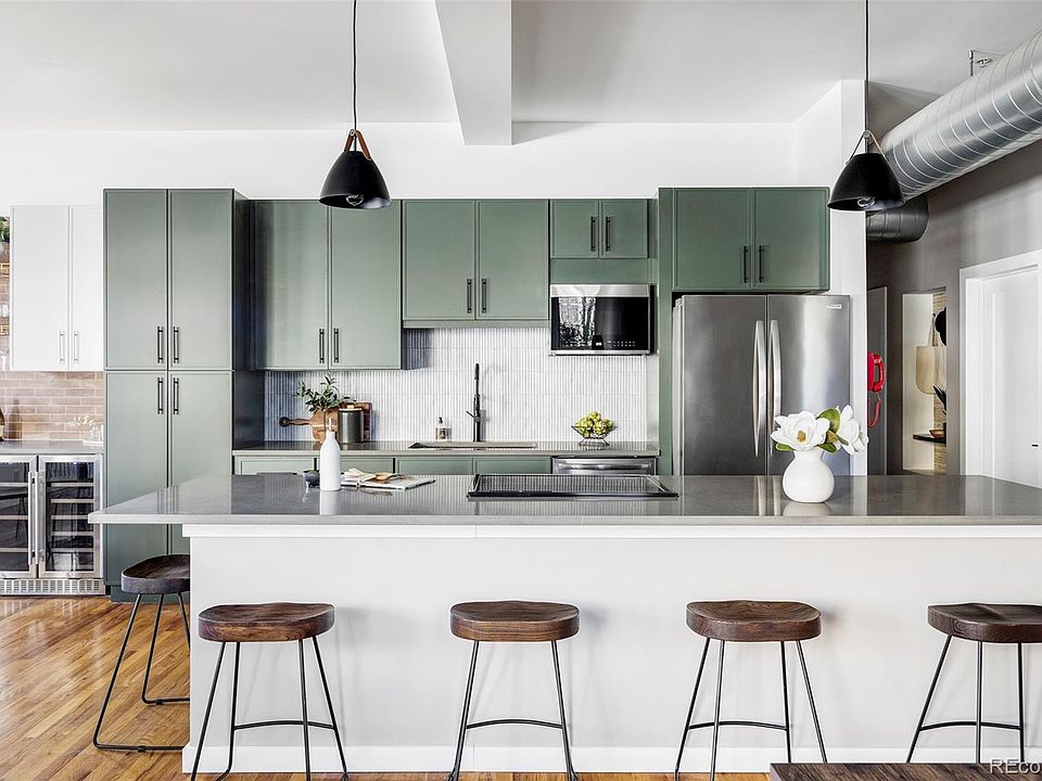 Tucked away on the quiet, off-street side of The Overlook boutique condo community, #2F offers a rare fusion of curated design and a well-managed HOA with impressively low dues—all in the pulsing heart of LoHi, one of Denver’s most dynamic and beloved neighborhoods. Every aspect of this residence has been carefully selected, beginning with a completely renovated kitchen featuring soft-close cabinetry, elegant designer hardware, sleek new appliances, and an expansive quartz island—an upgrade seldom seen in one-bedroom homes at this price point. Adjacent to the kitchen, a full-sized dining room equipped with a custom bar and beverage refrigerator sets the stage for effortless entertaining, while ample room for a work-from-home station brings flexibility to the open layout. Step out onto your private balcony to take in panoramic views of the Millennium Bridge and Downtown Denver, offering the perfect backdrop for tranquil mornings and vibrant city nights. The fully remodeled bath is home to a new vanity, frameless glass shower, designer tile, and the added benefit of a premium Schluter Kerdi waterproofing system. The bedroom features dual closets for optimal storage, while fresh paint and designer lighting throughout the home create a bright, inviting atmosphere. An in-unit storage room houses a brand-new LG washer and dryer, adding further convenience. Parking is easy with a secure garage space, as well as a private storage unit for outdoor gear and extra belongings. The community also provides the rare benefit of guest parking—an invaluable asset in this lively neighborhood. Living at The Overlook offers instant access to Denver’s best: Union Station, I-25, I-70, and the Cherry Creek Trail are just outside your door, while award-winning restaurants, cozy cafes, top sports venues, and lush parks are only steps away. This residence is more than just a home—it’s a lifestyle that seamlessly blends relaxation, urban excitement, and unmatched convenience.