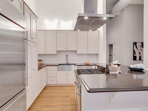 Soaring 13-foot ceilings and massive east-facing windows flood the space with natural light and frame jaw-dropping views of the Denver skyline. The stylish kitchen is a chef’s dream, featuring sleek Decora cabinetry, a farmhouse sink, custom pull-out shelving, and top-of-the-line appliances—including a Viking gas cooktop.