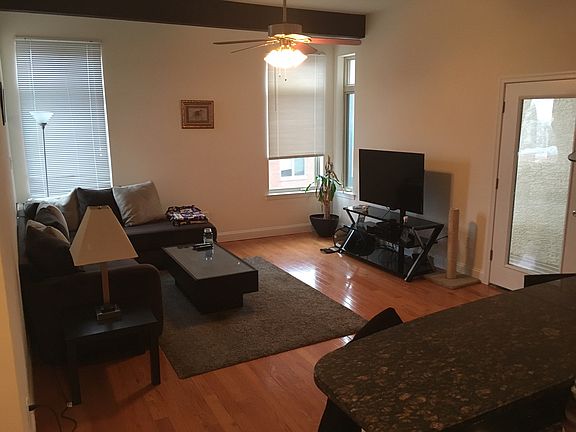 Modern and Spacious 1 Bedroom 1 Bath with great views of the city skyline. Building was built in 2014. Beautiful finishes with 10' ceilings. Red Oak Bruce Hardwood Flooring. Kitchen include stainless steel appliances, granite countertops, tile backsplash, gas cooking, dishwasher, and garbage disposal. Private washer / dryer in unit. High efficiency heat and central air. This unit has lots of closet space. Videos surveylance system in place for community areas and front sidewalks. Optional off-street gated parking may be available. This unit has a private deck....plus access to a large community roof deck with magnificent 360 views of the city and a wonderful ground floor community garden with a tranquil fountain. Off Street Parking may be available for $125/month. JULY 1ST LEASE START DATE. $75 Application Fee per applicant, + first month's rent deposit with application. Minimum 1 year employment with current employer. Current and previous landlord reference required. Minimum First month's rent, Last Month's rent and Security Deposit equaling one month's rent. No Co-signers. No Dogs. $500 partially refundable pet deposit for a cat.