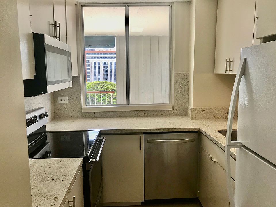 Recently remodeled 7th floor apartment with new Quartzite countertops and Luxury Vinyl plank floors. Complete interior paint, very fresh, clean and bright! Spacious apartment of 1,051 sq. feet + fun tiled lanai of 175 sq. feet. New smoke detectors, LED lights and ceiling fans for air circulation. Newer appliances include: glass top stove/oven, microwave oven hood, dishwasher, garbage disposal and clothes washer and dryer. Exceptional amount of large closet space and storage. No furniture included. Unit is vacant and ready to go! Two uncovered parking stalls included. Rent includes: water, sewer & garbage. Tenant pays: Electric, TV cable, Internet-Telephone. Unit is available: 3/5/2025 for a one year lease. No pets and non-smokers only. Tenant to provide a Renter's Insurance Policy when signing a lease. This is what you need to rent this apartment: 1) Minimum credit score of 650 2) Verifiable monthly income of $6,875.00 3) Agree to sign a one year lease. Tenant must view in person before submitting an application.