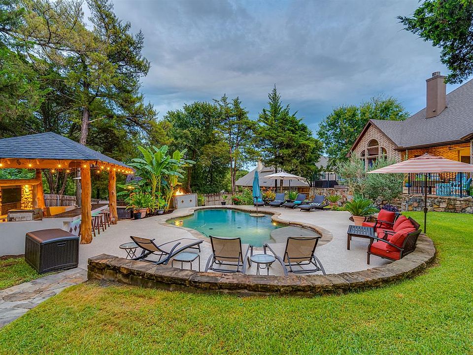 Amazing home in Gated Community with an Oasis Backyard! Wonderful upgrades make this a dream home! Split bedroom arrangement, all downstairs - 4 nice size bedrooms, 3 full baths, study or office with builtins, large dining room & upstairs gameroom with bar & wine fridge means room for everyone & still room to work from home! One of the bedrooms is separate from others so perfect for a mother-in-law suite. 2 full size garage spaces with 1 smaller separate garage perfect for golf cart or 4 wheeler or compact car. Beautifully landscaped with pool, outdoor kitchen & cabana area plus several other outdoor seating areas. Great place for entertaining! Adorable garden shed remains with property.
