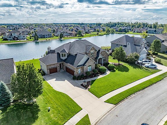 Spacious 3-level living in this custom-built, waterfront home by Sistevaris Builders. Over 5,000 SF of finished living space. The stunning front door offers beautiful, Craftsman-style sidelights, and draws you right into the 2-story foyer and great room. A formal dining space is to your left, and is currently being used as a home office. The great room is bright with floor-to-ceiling windows. To the right is the primary suite with a lighted, trey ceiling, walk-in closet, and spa-like bathroom with a step-in shower, separate jetted tub, and double vanity. The chef’s kitchen offers an island with seating, upgraded stainless steel appliances, a step-in pantry, and loads of counter space. The kitchen overlooks the beautiful hearth room with a cozy gas log fireplace, and the spacious casual dining area with room for a large gathering. An extra-wide sliding door will take you outside onto the upper level deck to enjoy the fabulous water views. Take the steps down from the deck onto a lower level stamped concrete patio with a built-in gas grill and hot tub. Also on the main level is a half bath for guests, a separate laundry room, and a convenient mud room for dropping the shoes and backpacks. Upstairs, there are 3 bedrooms; one bedroom has a private full bath, and the other two share a Jack-and-Jill style full bath. All 3 bedrooms have walk-in closets. The lower level is perfect for entertaining, working out, or just relaxing. The spacious family room has large, daylight windows to allow plenty of natural light. A home gym is complete with soft impact flooring and a climbing wall! The fifth bedroom is also on the lower level, and offers a unique walk-through closet into a shared full bath. Additional amenities include a manabloc plumbing system, double water heaters, built-in surround sound throughout the home and on the deck, and an irrigation system. Safety features include a radon mitigation system and a sump pump with battery back-up. Located in the desirable Southwest Allen County Schools district, with every convenience within minutes, including shopping, restaurants, places of worship, schools, entertainment, medical facilities, and parks and trails. A 3D virtual tour is available, as well as private showings. **ACCEPTED OFFER ON FILE; Showing for Backup Offers Only**