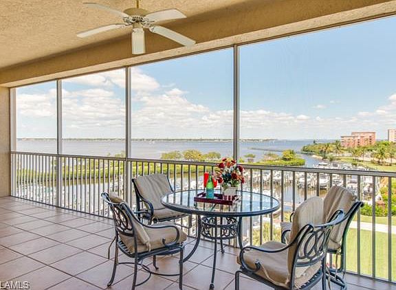 Wow! The spectacular, long views of the Caloosahatchee River & the lovely marina & private island capture your attention in this exquisite 4th floor corner condo in Harbour Isle Yacht & Racquet Club. This open floor plan is a spacious 2,356 sq ft with 3 bedrooms & 3 full bathrooms. A lovely wrap-around lanai captures the river breezes & views! Pocket sliders open to extend the living space of the large great room with hardwood floors for outdoor living at its finest. The dining area is perfect for entertaining & the open kitchen has granite countertops (new in 2014), an island & a huge breakfast bar that can seat 4-6 people. Two master suites are an added feature - the main owner's suite opens to the lanai & river views & has a generous ensuite with his & hers closets, double sinks, shower & soaker tub. The 2nd master w/ensuite & 3rd bedroom & bath welcome your guests. High tray ceilings, crown moulding, built in cabinets, new carpeting & dryer in 2015, A/C & water heater replaced in 2011. 2 pools, tennis, marina, fitness, private island, assigned covered parking & storage unit. Gated community. Minutes to Sanibel & Ft. Myers Beaches. One owner. Never rented.