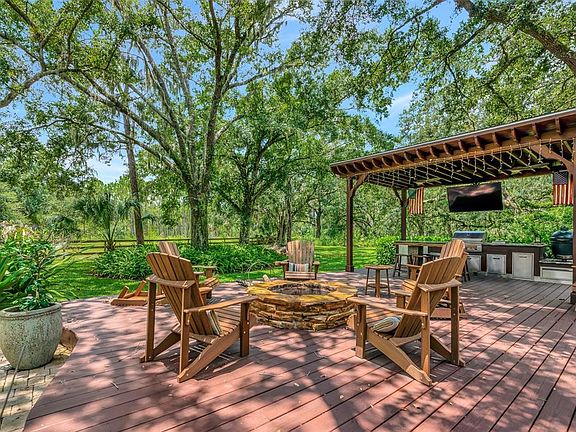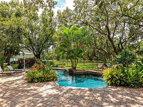 Rare 5 acre private estate with NO HOA or deed restrictons! An Equestrian Oasis Just Minutes from Lakewood Ranch! Saddle up for the perfect blend of horse country serenity, peaceful country living and suburban convenience. This one-of-a-kind 5-acre estate is the closest acreage property to Lakewood Ranch, offering the freedom, room, privacy without sacrificing access to top-tier shopping, dining, and entertainment. Tucked beneath a canopy of 100+ year-old grandfather oaks, this 4-bedroom, 3-bath home spans over 3,104 sq. ft and includes dual home offices (or a 5th bedroom)—ideal for multi-use living and remote work with room to roam. A private asphalt driveway leads you through lush, shaded pastures, setting the tone for the tranquil country setting that awaits. Inside, enjoy bamboo flooring downstairs and tile upstairs. The heart of the home a renovated 2020 kitchen features custom hardwood cabinets, granite countertops, and stainless steel appliances, perfect for hosting gatherings. Step outside into a true outdoor retreat, where a freeform pool, covered outdoor kitchen, paver patio, Sonos surround sound, lighting, and fire pit come together to create a dream space for both relaxation and celebration. Whether you envision an equestrian property, owning farm animals, building a workshop, storing equipment, or simply enjoying wide open space, this property provides the freedom and flexibility most neighborhoods can’t offer. Horse enthusiasts will be drawn to the 30’ x 30’ center-aisle barn with 4 stalls and tack room thoughtfully positioned for convenience and comfort. The rear of the property is fully fenced and includes a professional-grade round pen, lush grazing pastures, and oak-shaded paddocks that offer natural cooling and beauty. A scenic pond adds to the peaceful atmosphere, and there’s a separate RV/boat metal-framed structure with a metal roof that's ideal for horse trailers, RV or boat storage, or equipment. Schedule your private tour today!