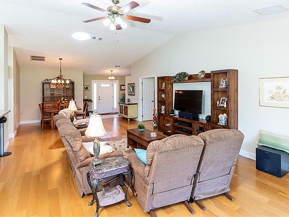 MOTIVATED SELLER. GOLF COURSE FRONTAGE! Very well maintained 3/2 Tarpon model with beautiful wood floors in the main living areas. Kitchen has newer appliances. Newer AC in 2016. Tiled rock look flooring in the lanai which is enclosed with windows and screens overlooking the 12th hole on golf course. Large master bedroom & bath. Garage floor covering is rubber tile. HOA covers Wifi, Cable, Amenities, Trash, & Mowing. Don't miss out on this retirement home in a great retirement community.