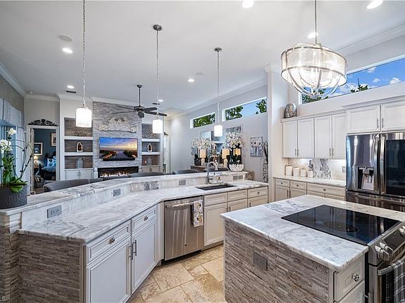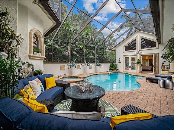 H.704-Fabulously updated and meticulously maintained. New roof -2018, updated kitchen with white cabinetry, marble countertops, newer LG refrigerator, microwave and wall oven. A ZEN oasis in the owners suite includes: marble flooring, sitting area, slider access to covered lanai and pool area, 2 custom closets. Spa-like bath with separate vanities, large walk-in shower with pebble stone flooring and multi jet shower sprayer. Open floor plan yet extra space for every day living. Family room is accented by stacked stone fireplace wall with built-ins and large sliders to pool & covered screened lanai. 2 story guest cabana is set up as 2 bedrooms, breakfast room, morning kitchen and a full bath, spiral staircase and lots of natural lighting. The privacy of this courtyard pool and spa affords you the perfect place to entertain friends and family. New summer kitchen and redone garage with epoxy floors and custom cabinetry. Located at the cul-de-sac with no neighbors on one side this home affords the utmost of privacy one could wish for. Extensive landscaping and mature trees along with fountains, paver and shell stone walk walkways. An absolute tropical oasis for you new home in Naples.
