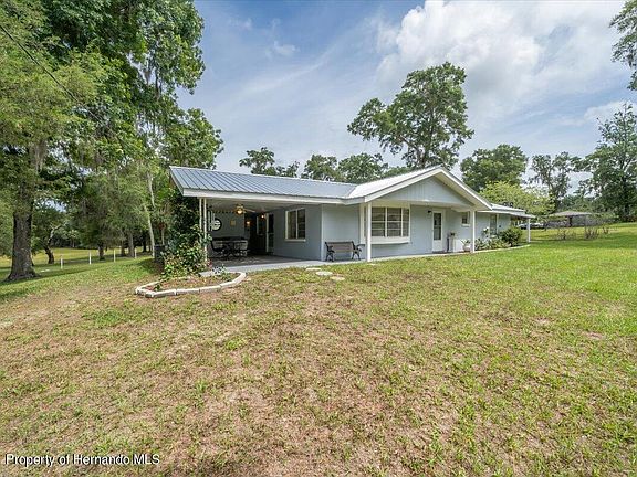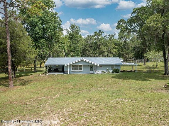 Home Sweet Home! This charming well maintained home is move in ready and features three bedrooms, one bath, eat in kitchen, large living room and a fully enclosed rear room that is under heat and air which can be used for an additional bedroom, family room or office. You will also have plenty of outdoor space as the home has two carports for parking or outside patio space. There is also a spacious storage room and laundry room for your convenience. You will enjoy 2 acres of beautiful property in the country with a large barn/workshop/garage plus a utility shed. Bring the animals as there will be plenty of room for chickens, goats, sheep, llamas or a horse or two. There is some fencing in place and the front has two entrances with gates. This home has been well maintained with some newer carpet and paint. You will love the beautiful terrazzo flooring through much of the home. The owner has installed a brand new metal roof in 2021. The location can not be beat as it is close to the Suncoast Parkway for an easy commute into Spring Hill or Tampa. It is also an easy dive into historic Brooksville or Homosassa for the gulf boating or fishing. This property has so much to offer and must be seen to be appreciated. Schedule your showing today!