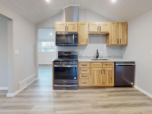 The living and dining areas are bathed in natural light, thanks to expansive windows that frame a picturesque West/ NW view over Munson Lake. Vaulted ceilings in select areas create an airy ambiance, enhancing the sense of spaciousness throughout the home. Rich, wood-look LVP flooring unifies the space, offering both durability and aesthetic appeal.
