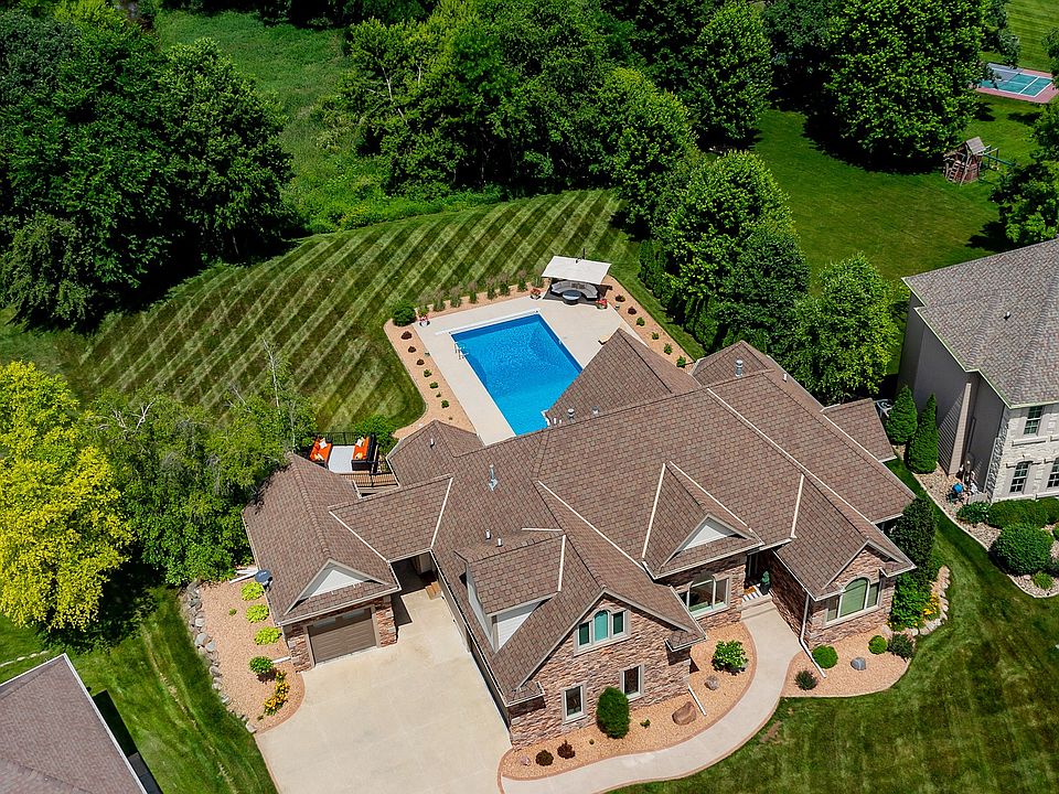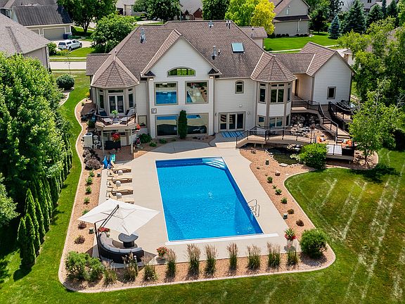 This stunning ranch is nestled on a .86 acre lot backing to a creek & timber oozing curb appeal. Highlighted by an entertainer's backyard with a 20x40 saltwater pool, multi-level composite deck, koi pond, waterfall, professional landscaping & surrounded by picturesque views! You're welcomed to a sprawling great room with a vaulted ceiling, expansive windows overlooking the backyard, arched fireplace & custom built-ins. The inviting kitchen has abundant cabinetry, stainless-steel appliances with double wall oven, two-tier island, pantry & opens to a spacious hearth room with fireplace & eat-in dining nook. A formal dining area boasts unique decorative trim accents. The renovated owner's suite features a double tray ceiling, fireplace, private deck, dual vanities, soaker tub, large tile shower & custom walk-in closet. A formal office, half bath, laundry & mudroom complete the main level. Upstairs find a large bedroom or flex space with an en-suite full bath. The walkout lower level offers a sunken living room, rec area, wet bar with full fridge & dishwasher, 3rd & 4th bedroom each with their own en-suite, theater room, half bath & slider access to the patio & pool. Meticulously maintained and updated, this home is ready for you to enjoy & make your own!