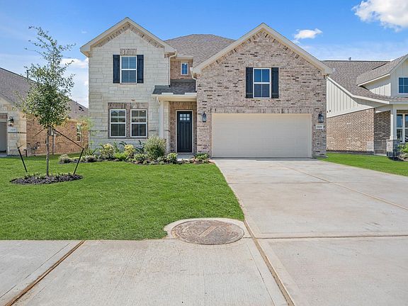 Welcome to Centennial Oaks, Santa Fe’s newest gem, where timeless style meets modern comfort. This stunning two-story Omaha in our Farmhouse Look offers 4 bedrooms, 3.5 baths, and a 2-car garage. Step into a welcoming foyer highlighted by a striking feature wall that sets the tone for the home. At its heart, the chef-inspired island kitchen showcases Brellin Greyhound cabinets, open floating shelves, and elegant Carrara Morro quartz countertops, seamlessly opening to a sunlit great room with soaring ceilings. A casual dining nook with patio access is perfect for everyday meals, while the formal dining room provides an elegant setting for special gatherings. The serene primary suite features a designer wall accent, spa-like bath with freestanding tub, and a spacious walk-in closet. Upstairs, a versatile gameroom offers endless possibilities. Relax outdoors on the covered patio overlooking peaceful water views. Prime location near Hwy 6 & I-45 with shopping, dining, and low taxes.