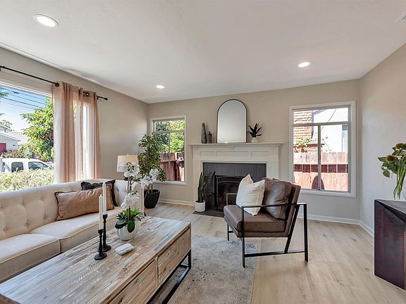 Discover this meticulously maintained single-story home in the popular Assumption Parish neighborhood of San Leandro. This charming home features 3 bedrooms and 1 bathroom, offering a flexible floor plan perfect for modern living. Upon entry, you’ll find a warm and inviting living room with a cozy fireplace and plenty of natural light, leading to an adjacent formal dining room. The kitchen shines with new stainless steel appliances, quartz countertops, and recessed lighting. Additional updates include new floors, ceiling fans in each bedroom, fresh paint inside and out. The owned solar system and new central heating provide comfort and efficiency year-round. The home was also fully seismically retrofitted for added peace of mind. The outdoor space is a gardener's paradise with a variety of sage plants and fruit trees, including fig, lemon, avocado, mandarin, and navel orange. The patio area is ideal for relaxation and entertaining. Conveniently located near schools, major freeways, a short5 minute drive to Lake Chabot, walking distance to Starbucks, Walgreens and other stores, and just 1.5 miles from BART, this home offers both charm and practicality. The finished garage adds extra utility to this must-see home. Don’t miss the chance to own this beautifully updated gem.