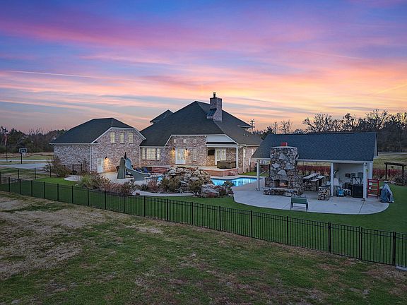 This exceptional property sits on 8 picturesque acres featuring a serene creek, private camping site, and wooded trails. The resort-style backyard is a true showpiece, complete with a heated saltwater pool and an impressive covered outdoor pavilion outfitted with a stone fireplace, full kitchen, pizza oven, and bath—perfect for entertaining year-round.