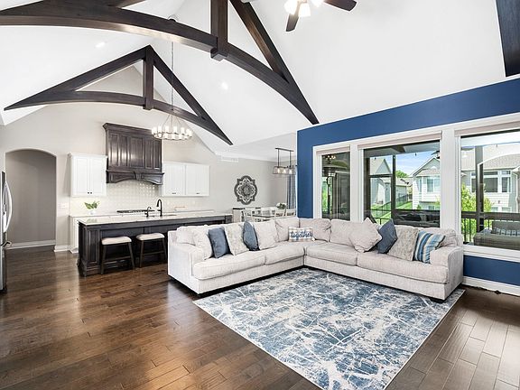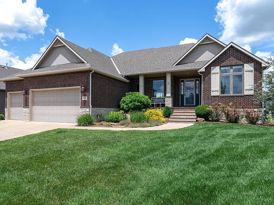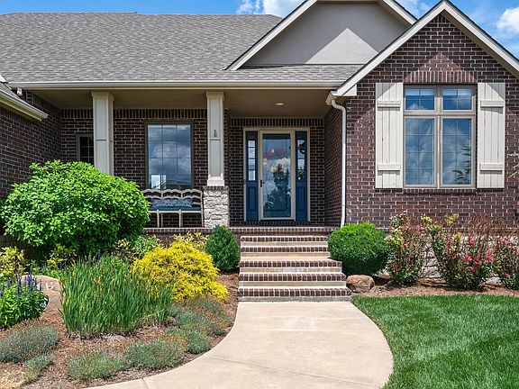 Discover the perfect blend of luxury and functionality in this exquisite 6-bedroom, 4-bathroom home located at 15220 Sundance St, Wichita, KS. Designed by Nies, this property is nestled in the highly desired Stonebridge community, offering top tier finishes and unparalleled comfort. Step inside and immediately notice the stunning 18-foot vaulted ceilings with elegant wood beams and modern lighting, setting a grand tone throughout. The open concept living area features rich hardwood flooring, white trim, and crown molding, all bathed in natural light from expansive windows equipped with electric blinds. At the heart of the home, the gourmet kitchen is a chef's dream. Highlights include a large granite island, state-of-the-art appliances including a gas range, double ovens, and a Bosch dishwasher. The kitchen also features white cabinetry with pull-out shelving and a hidden walk-in pantry. This space effortlessly opens to a screened back deck, perfect for entertaining and relaxation with a view of the splendid saltwater cocktail pool with a tiled waterfall. The luxurious master suite on the main floor offers hardwood floors, and an ensuite bathroom resembling a spa, complete with double shower heads, a deep soaker tub, a granite-topped vanity, and a spacious walk-in closet. Additional convenience is offered by the main floor laundry with a hand sink and drop zone off the three-car garage. Venture downstairs to find a fully finished walk-out basement, complete with a family room featuring a cozy gas fireplace, an updated wet bar with quartz counters, a stone accent wall, wine fridge, and ice maker. The remodeled bathroom boasts a walk-in tiled shower and solid countertops. Each of the three bedroom in the basement provides ample space and a walk-in closets. Outdoor living is equally impressive, featuring a stamped concrete patio with a gas firepit, a fully fenced backyard, and an inviting saltwater pool cocktail pool. Located in the prestigious Andover school district with Sedgwick County taxes, this home is within easy reach of award-winning schools, the Redbud Trail, and all the amenities Northeast Wichita and Andover have to offer. Experience modern living in an established community—make this stunning house your new home.