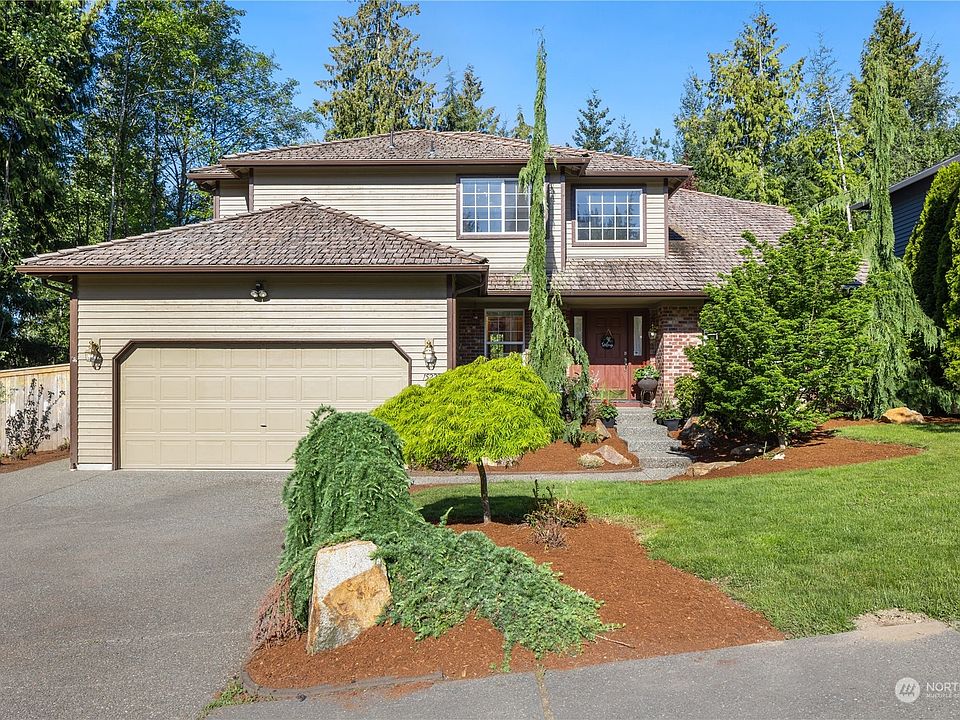 Spacious & private .20 acre double greenbelt corner lot in Silver Firs. Cul-de-sac neighborhood. 2-story home w/2-car attached garage. Enter to open living & dining rooms w/vaulted ceiling. Hardwood floors throughout main floor. Great room style kitchen & family room. Gas FP. All appliances stay, including W/D. Upstairs are 4 bedrooms including primary bed w/5-piece ensuite bath & walk-in closet. Full guest bath. Beautiful mature landscaping. Serene fully-fenced backyard w/entertainment deck overlooking wooded greenbelt. Enjoy gardening in the raised beds & sitting around the in-ground fire pit. Shed for additional storage. Great location, just minutes to Mill Creek Town Center + several nearby parks. 1-Year Home Warranty included.