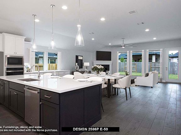 Porch leads to entry with 12-foot ceiling framed by home office with French doors. Open family room with a wood mantel fireplace and wall of windows extends to the kitchen and dining area. Island kitchen features built-in seating space and a corner walk-in pantry. Secluded primary suite with a wall of windows. Primary suite features a double door entry, dual vanities, garden tub, separate glass enclosed shower, linen closet and two walk-in closets. Private guest suite with a full bathroom and walk-in closet near front of home. Secondary bedrooms with walk-in closets and a utility room complete this spacious design. Extended covered backyard patio. Mud room just off the two-car garage.
