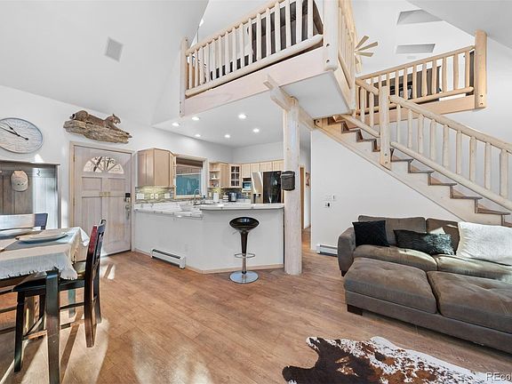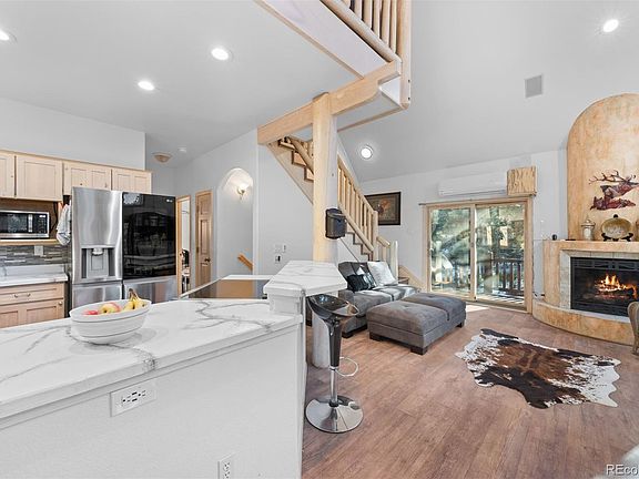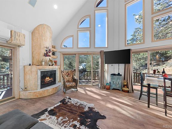 Tucked along the banks of Trout Creek in the Rainbow Falls gated community, this two-acre retreat offers a blend of natural beauty and modern comfort. With the soothing sounds of the river and the sight of five cascading waterfalls, this property immerses you in serenity. A gazebo and riverside firepit provide idyllic spots to enjoy the outdoors, while expansive wraparound decks invite you to take in the views from every angle. Inside, floor-to-ceiling windows frame the lush surroundings, bringing the outdoors in. The primary suite features a private deck overlooking the creek, while the lower level is designed for fun with a pool table, gaming area, and full bar. Whether you’re hosting friends or seeking quiet moments in nature, this home delivers both. Just 20 minutes from Woodland Park and a short drive to Deckers, it combines seclusion with convenience, making it the ultimate mountain retreat.