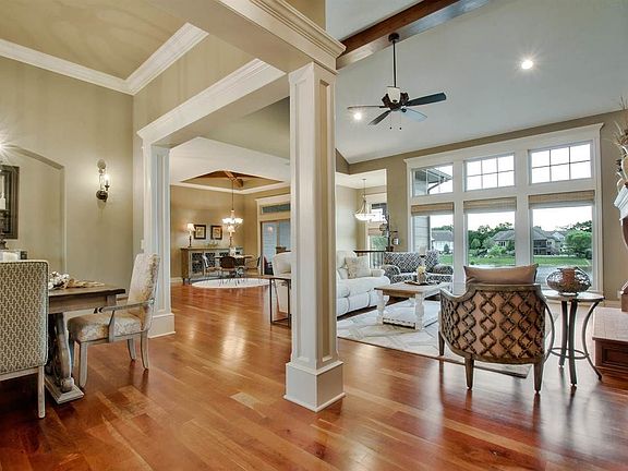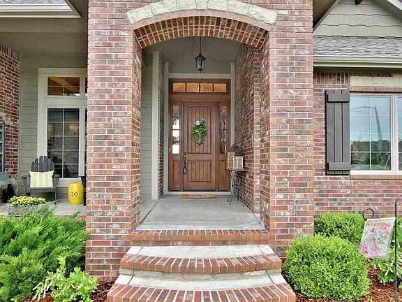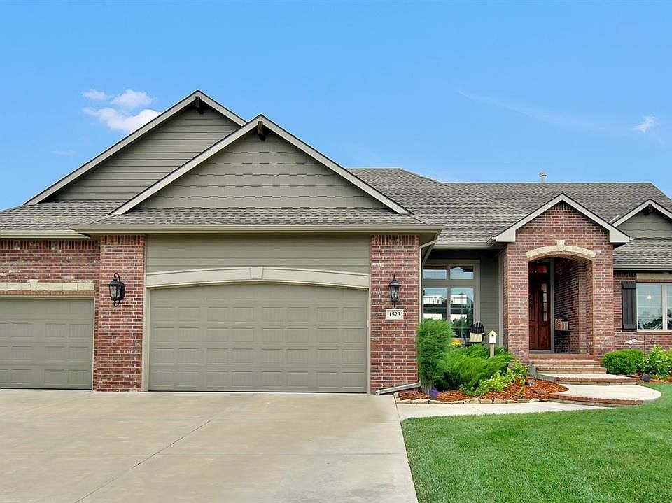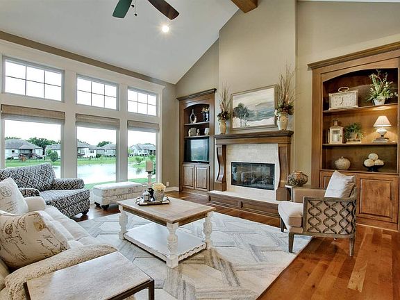 Stunning split bedroom ranch situated on a beautiful lake lot in desirable Stonebridge shows like a model home! This showstopper offers beautiful curb appeal, a covered front porch, gorgeous cherry hardwood flooring, upgraded finishes throughout, a vaulted ceiling, wood beams, white trim, crown molding, custom window treatments, formal dining, two gas fireplaces, a powder room on each level, mid-level walkout, a fully finished view out basement and a three car garage. The well appointed open floor plan is ideal for entertaining yet cozy for everyday living. Floor to ceiling windows spanning the back of the home soak the living spaces with natural sunlight and allow for panoramic view of the water. The heart of this home is an exquisite great room with a beautiful fireplace flanked by built-in bookcases. The gourmet eat-in kitchen is well suited for any cook with a large center island/eating bar, granite counter tops, stainless steel appliances, gas range, decorative hood vented to the outside, walk-in pantry, under cabinet lighting, display shelving and an abundance of cabinetry and countertop space for prepping and serving. Conveniently located adjacent to the kitchen, a back hallway with built-in cabinets, a built-in bench with hooks and cubbies, powder room and laundry room adjoining the master bedroom closet allows for maximum efficiency in your daily living. Retreat to a lovely master suite complete with large windows overlooking the lake, deck access, dual sinks, soaker tub, separate tile shower, private toilet and a walk-in closet with seasonal bars. Two more bedrooms with a jack-n-jill bath are found on the opposite wing of the main level. Gathering is made easy in an exceptional basement showcasing a rec/family room with a gorgeous wet bar with stone columns, a gas fireplace, plenty of room for your favorite game table, two bedrooms connected by a jack-n-jill bathroom, a guest bathroom, storage and a bonus room. This additional finished room has endless possibilities as a future media room, exercise room, play room or office. Extend your living space outdoors on an incredible lake lot featuring a covered deck, expansive patio with a built-in grill, professional landscaping, sprinkler system, irrigation well and a garden bed. Located in Sedgwick County in the Andover School District, this immaculate ranch is just like new!