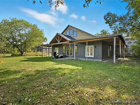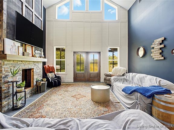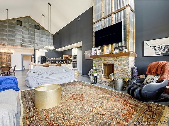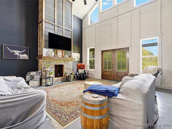 Step into your own rustic lodge retreat—crafted with every detail in mind. This rare find offers privacy within city limits and is just minutes from I-65, shopping, medical offices, and the local YMCA. You’ll enjoy the sounds of nature with the ease of in-town living. The three-sided wraparound porch with pine ceilings and metal accents sets the tone for what’s inside—warm, elevated, and unforgettable. Inside, 26-foot ceilings frame a show-stopping floor-to-ceiling fireplace, double wood doors, and rich tones with custom metal and wood accents. The kitchen is the definition of a design dream—two islands, two black sinks, a gas cooktop, butcher block countertops, African cherry hood vent, KitchenAid lift cabinet, and space for a twelve-person table. Light pours in from every angle through oversized windows, highlighting the open concept and stained concrete floors that flow throughout. This home features four bedrooms, three-and-a-half baths, a home office, mudroom, and flexible spaces that adapt to your lifestyle. The primary suite feels like a retreat, complete with vaulted ceilings, a private porch door, soaking tub, and makeup vanity. The attached garage? Massive, versatile, and ready for it all—basketball hoops, campers, or even a dog spa with plumbing and electrical already in place. Opportunities like this are rare. Schedule your showing today and experience this one-of-a-kind lodge for yourself!