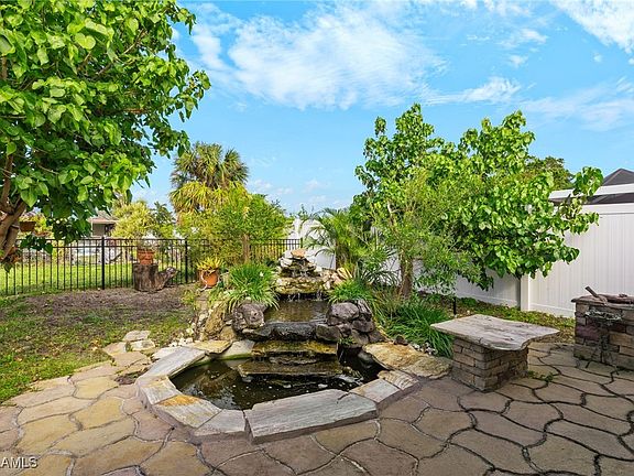 Welcome to your charming 4-bedroom, 2-bathroom home located in the heart of Cape Coral. No Flood Zone (X) does not require flood insurance. This property has all assessments in and paid, underground utilities and no cast iron plumbing! Relax next to the tranquil outdoor pond and waterfall. Inside you will find a secluded living room which features a built in entertainment area that is prewired for surround sound. The gourmet kitchen features custom wood cabinets and granite counter tops, stainless steel appliances and a snack bar. The dining area is right next to the kitchen which makes it a convenient place for entertaining. The master en suite bath features dual sinks with an oversized walk in shower. The second bath features a new tub/shower. This home also features an under air laundry room, a two car driveway, automatic sprinkler system, luscious landscaping and a large shed in the back yard for all of your storage needs. There is still plenty of room for a pool, if desired! This home is only minutes away from downtown dining and entertainment and several family friendly parks. Don't forget to click on the virtual tour link & schedule your private showing today!