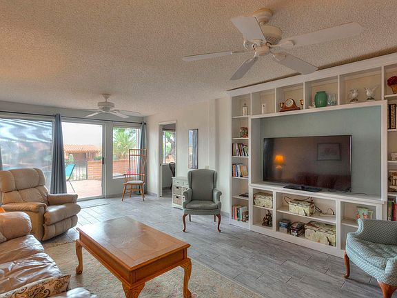 Enjoy the fantastic mountain views from the back patio of this end-unit townhouse in Desert Hills. This home features wood-look ceramic tile through out, extra custom cabinetry in the kitchen, newer counter tops and solid surface sink. The living room and master bedroom are extended adding lots of extra living space. The retractable awning on the back of the home provides a little extra shade when you need it and awnings on the east facing windows keep the home cool in the morning. The garage door on the carport gives you privacy and the front sitting area has a patio cover and draw-down sun shades. This is a desert jewel you don't want to miss! Some furniture available on SBOS.