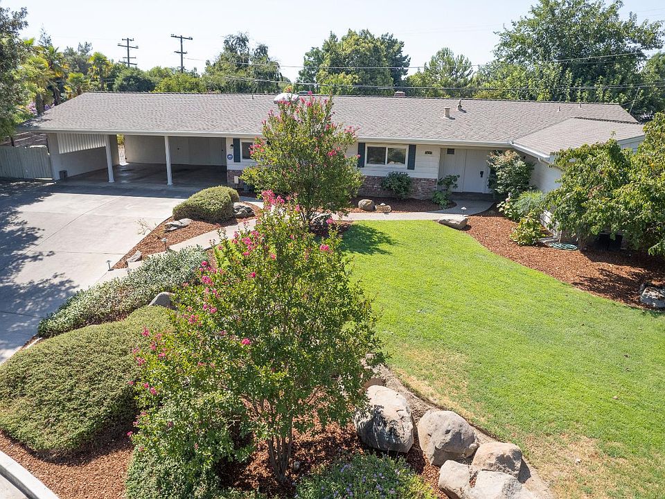 Charming, well cared for home in NW Fresno! This stunning single-story home is set on an expansive +/-16,800 square foot lot, offering ample space and privacy. Boasting 4 bedrooms and 3 bathrooms, the home features two inviting living rooms, a formal dining room, and a cozy brick fireplace in the family room. Vaulted wood ceilings add a touch of rustic elegance. The property is equipped with OWNED SOLAR and dual pane windows, providing energy efficiency. Recently resurfaced, the in-ground pool provides a refreshing retreat, complemented by a large covered patio perfect for outdoor entertaining. The wide side yards and fruit trees enhance the outdoor experience. Additional highlights include spacious storage cabinets in the carport and a prime location in NW Fresno.*33 solar panels*13.2 kw system*lot is 200 ft. wide at the back*Fruit trees: grapefruit, orange, tangerine etc.*2 sheds*wide side yards*dual pane windows*brick fireplace*4 bed/3 bathCharming, peaceful neighborhood near some of Fresno's finest dining and shopping.