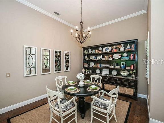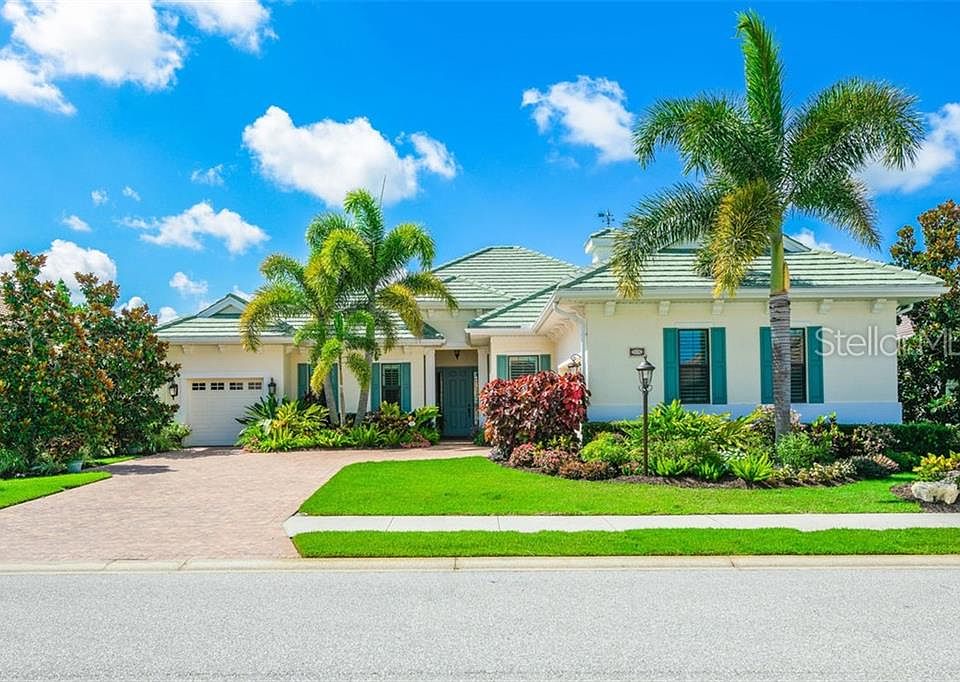 This well appointed custom home in Country Club East showcases stunning curb appeal with custom features and upgrades throughout. Expertly designed with an open floor plan and casual dining area, this immaculate and move-in ready home offers three bedrooms, two full baths, powder bath, den and a split 3 car garage. The living areas showcase beautiful hardwood flooring, crown molding and millwork details and custom plantation shutters. Fit for a chef, the gourmet kitchen boasts stainless steel appliances, solid wood cabinetry, granite countertops, custom stone backsplash, and a large island/breakfast bar and dry bar. The master retreat features bay windows, tray ceiling, private access to the sparkling pool and spa and a luxurious bathroom with dual sinks, solid wood cabinetry with plenty of storage, tiled walk-in shower, gorgeous travertine stone flooring and huge walk-in closet. Large sliders lead out to the covered lanai with brick pavers and an inviting heated pool and spa overlooking the tropical landscaping creating the ultimate private oasis. Lakewood Ranch offers residents the ultimate Florida lifestyle with a Private Country Club, 4 golf courses, 18 lighted tennis courts, athletic facilities, polo club and parks. Additionally, Country Club East provides residents with the privacy of gated-community living and the benefits of easy accessibility to everything you need from family-friendly and gourmet restaurants to exceptional shopping and entertainment -- it???s all just steps away.