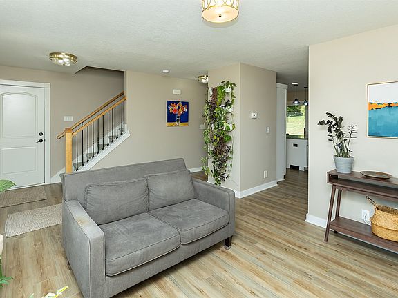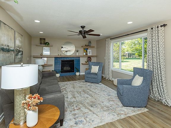 style. The main floor features a cozy living area centered around a charming fireplace with an eat-in