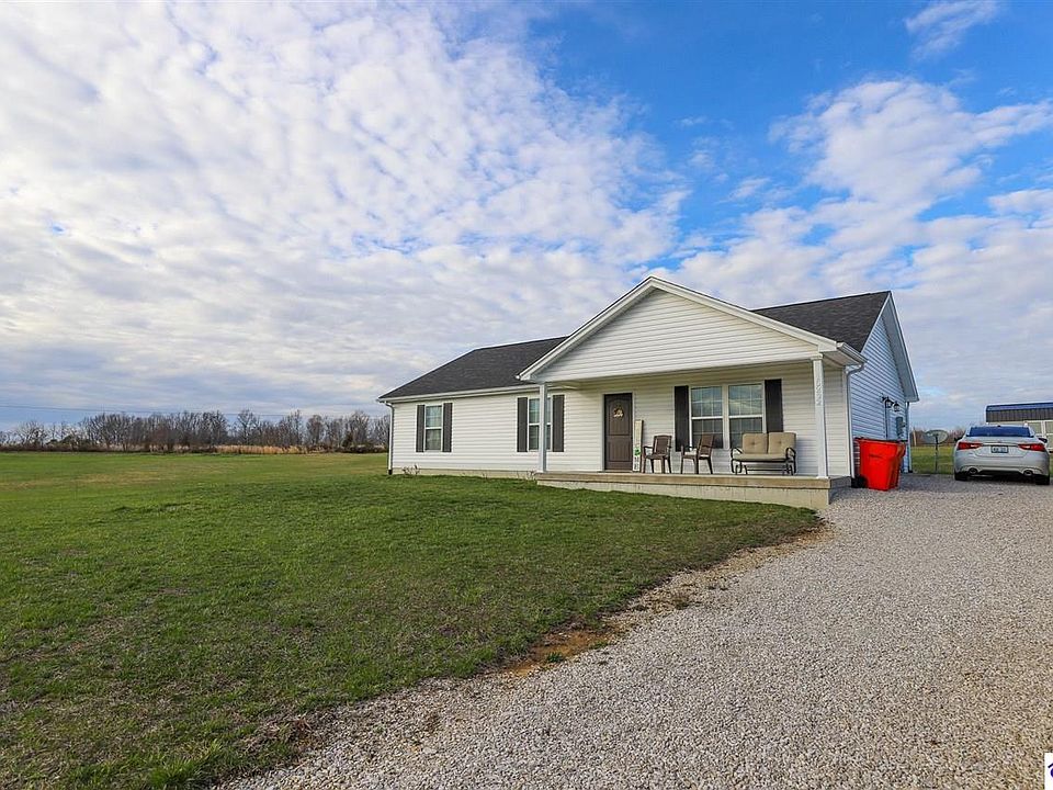 You will be captivated by this 3 year old home, that is beautifully nestled on 3.5 acres with scenic views of the countryside! The features of this home include the popular open floor plan, a spacious kitchen with a full appliance package & a pantry, a spacious living room and laminate style flooring throughout most of the home. No carpet! The primary suite is extra special to include a large walk in closet, and a stand up shower in the primary bathroom. The exterior of the home features a covered front porch, patio and a large shed behind the home. Schedule your viewing today!