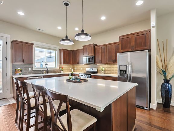 Amazing Newer Bethany home situated on a quiet street! The elegant north-facing entry welcomes you to a living room with a high 10ft ceiling, gleaming hardwood floor throughout, Wood wrapped windows, and a lovely gas fireplace with mantel. The additional Den/bonus room on the main with a double French door and wainscoting is a versatile place for work or to use as an additional sitting/entertainment area. Kitchen boasts a large quartz island to truly inspire the chef in you. With full-height backsplash, Under cabinet motion sensor lights with dimmer feature, stainless steel gas appliances, and an abundance of storage this modern kitchen will surely be a great place to host. The dining area takes you out through the glass door to a custom-designed backyard with over 25K in upgrades. Wide 2*2 stone pavers, color-changing stone LED lights, Stone pillars, Arbor vitae behind the fence for privacy, and an Arch arbor leading the pathway to the alley will surely please you. A half bath and an extra deep coat/storage closet are some of the essentials that complete the main level. The upper level has 4 beds, 2 Full baths, Custom tastefully designed Tech Niche with built-ins to provide maximum work area, and a laundry room with a sink, linen closet, and shelves. Primary bed w/vaulted ceiling, Walk-in double closets W/custom shelves in the room to keep the moisture away from the clothes. Luxury bath with quartz countertops, Tile floor, soaking tub, and standing shower to remove the tiredness of the day. 3 more spacious Bedrooms featuring closet organizers and one of them with a vaulted ceiling. The garage includes several overhanging and wall-mounted storage options for all your extras. Great Neighborhood with 5 parks and several trails including the famous Bethany Creek Park is a perfect place to hang out. Walk to Bethany Village and part of the Sato, Stoller, and Westview high school boundaries. Close to Intel, Nike, downtown, Hwy.It's a wonderful place to call home!