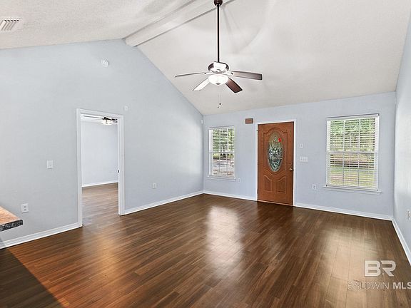 Welcome home!! This 3 bedroom 2 bathroom split floor plan home sits on .70 of a ACRE in Stapleton!! Located conveniently to Highway 59, shopping and minutes to the Eastern Shore! When you pull up to the property you will notice a long driveway and house settled behind trees. As you walk in the front door you will be greeted with vaulted ceilings and an open floor plan! The primary bedroom will be located to your right off of the living space featuring large walk in closet and private primary bathroom. Home has been freshly painted, new flooring throughout, backsplash added in the kitchen!!! Home is wired for surround sound and security alarm. This is a must see!! Buyer to verify all information during due diligence.