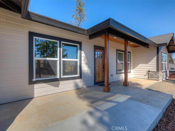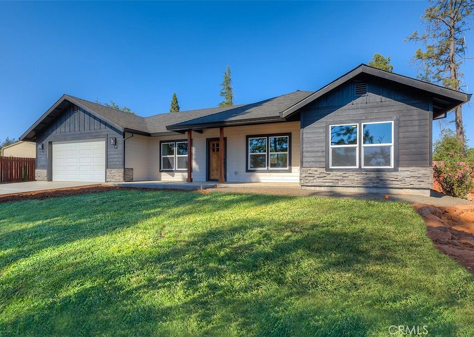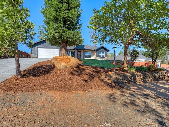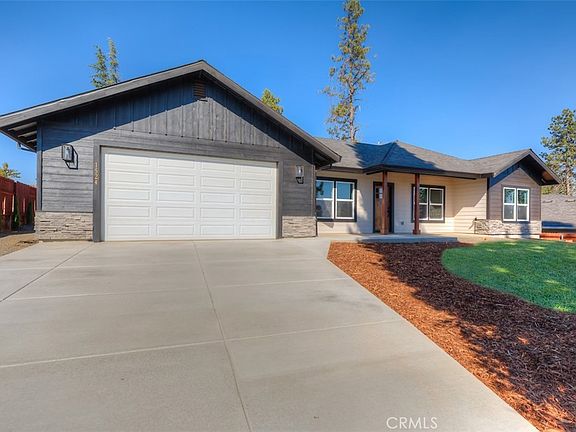 Nestled at the end of a peaceful court in the rapidly growing town of Paradise, this newly constructed home exudes charm and quality craftsmanship. Set on a hill with mature trees and a rock retaining wall, the property boasts a lush, fresh lawn and a convenient parking/storage pad by the road. Built with exceptional care by a local builder, the home's curb appeal shines through with striking contrast colors, stone accents, and a welcoming covered porch with a wood entry door. Inside, you'll find vaulted ceilings and an open-concept layout, featuring custom knotty alder cabinetry, a spacious pantry, quartz countertops, and a beautifully tiled backsplash in the kitchen. The primary suite is generously sized, complete with a double-sink vanity and an upgraded walk-in tiled shower. On the opposite side of the home are two spacious guest rooms and a full hall bath, offering privacy and comfort for family or guests. Step outside to a covered rear patio, perfect for relaxing or entertaining, and enjoy the large, level backyard surrounded by wood fencing. This is a home designed to be loved—come see it and fall in love with both the home and its perfect location.
