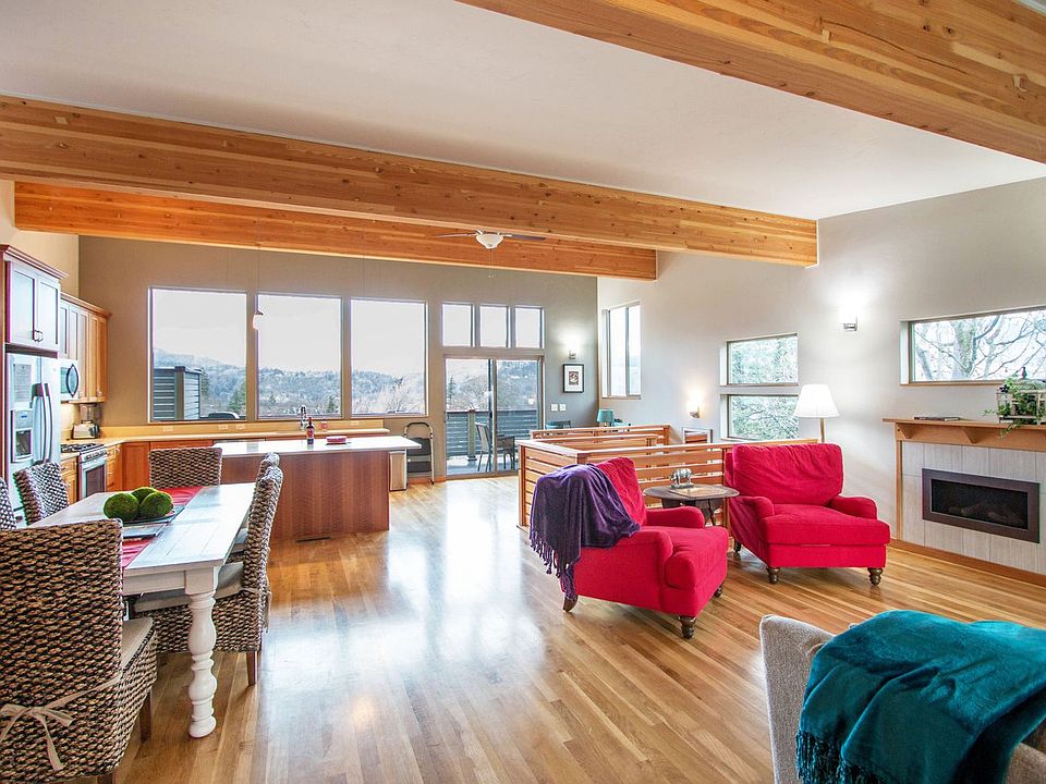 Experience the best of Hood River with this sophisticated townhome, Blackberry Bramble, offering breathtaking river and mountain views. This comfortable and convenient home provides a secluded and private getaway while keeping you close to Hood River's highlight destinations. The property features walls of windows that frame incredible views, and a large deck that invites you to enjoy the open-air experience right from your home away from home. Step inside to find a spacious open-concept floor plan with a living room that boasts a plush gray couch, two oversized red chairs, beautiful hardwood floors, and tall ceilings. The living room is centered around a large flat-screen television and a cozy gas fireplace, and it seamlessly connects to a modern kitchen with a central island, durable countertops, stainless steel appliances, and sleek wood cabinets. The lower level houses three spacious bedrooms, including a master bedroom with its own full bathroom, while the other two bedrooms share a second full bath. The modern kitchen is a traveling chef's dream, featuring a central island, beautiful and durable countertops, stainless steel appliances, and sleek wood cabinets. A small table for four is situated next to the breakfast bar, providing additional seating for meals with good company. The living room offers a plush gray couch, two oversized red chairs, and a cozy gas fireplace, making it a perfect space for relaxation and entertainment. The property includes an oversized garage, perfect for storing outdoor sporting gear during your stay. Wi-Fi is readily available, and the home is equipped with luxurious amenities to enhance your stay. Hood River is a paradise for vacationers and recreation enthusiasts, offering opportunities for windsurfing, mountain biking, kayaking, golfing, skiing, hiking, and fishing. The historic downtown features scenic streets lined with boutiques, designer shops, outdoor adventure gear outfitters, antique shops, art galleries, and over 30 restaurants. The Hood River Valley is renowned for its luscious apples, pears, cherries, peaches, and other fruits, as well as the majestic snowcapped peak of Mt. Hood. The award-winning Hood River Vineyards offers traditional wines and fruit liqueurs with a tasting room overlooking the valley. A laptop computer is not included. The property has air conditioning and offers an unsurpassed view that might tempt you to extend your stay in Hood River.