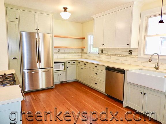 Two-bedroom house with well-kept front yard and fully fenced, oasis-type backyard in a peaceful neighborhood. This house has 1,184 SF with 2 bedrooms and one bathroom. Washer and dryer in basement. Hardwood and/or laminate floors throughout. No carpet. Great location! Walk to the Hollywood area of Portland. Shop at Trader Joe's, Fred Meyer and New Seasons nearby. Pet Policy: Cats or small dogs permitted for $30 pet rent and $250 pet deposit per pet. Limit: 2 pets. Garage and part of basement are used as owner storage. Tenants may park on the driveway but will not have access to the garage. Tenant may store items in basement. This property is managed by Green Keys Property Management LLC. We are looking for applicants who can start a lease sooner rather than later. Steps to take: 1. View the video tour by going to the greenkeyspdx website, clicking on Our Listings, and then click on the blue Video Tour button under the address for the 2-bedroom house on NE 54th Avenue. 2. Contact Green Keys to schedule a showing. The application period is open. There are no pending applications! Applications will not be considered complete until the online application has been filled out completely and the application fee has been received. Screening criteria: minimum monthly household income of 2.5 x rent; minimum credit score of 650. Application fee: $45 per adult. Utilities: Owner pays for garbage. Tenants to place all other utilities in their names at lease start date. Lease: 12 months; renewable if rent is paid on time. Utilities: Owner pays for garbage. Tenants to place all other utilities in their names at lease start date. Lease: 12 months; renewable if rent is paid on time.