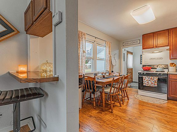 The cutest three bedroom expanded ranch style home that you ever did see! Decorated to perfection and within walking distance of the historic downtown district, Lincoln Community High School, and the Lincoln Park District, all you need to do is to bring your personal belongings, turn the key, and move right on in! The sleek well updated interior boasts a roomy and bright front facing living room with laminate flooring, a tastefully modernized eat-in equipped kitchen with a breakfast bar area, rear laundry/mechanical/mudroom area, updated full hall bath, and three comfortably sized bedrooms -- all with laminate flooring. Property also features a detached garage, neat rear rock patio area, recently paved driveway (2022), most vinyl replacement windows, and various modernized interior fixtures. Need appliances? They all remain here including washer and dryer. A hard to find turn key residential dwellings awaits you (and yours) -- ACT SWIFTLY!