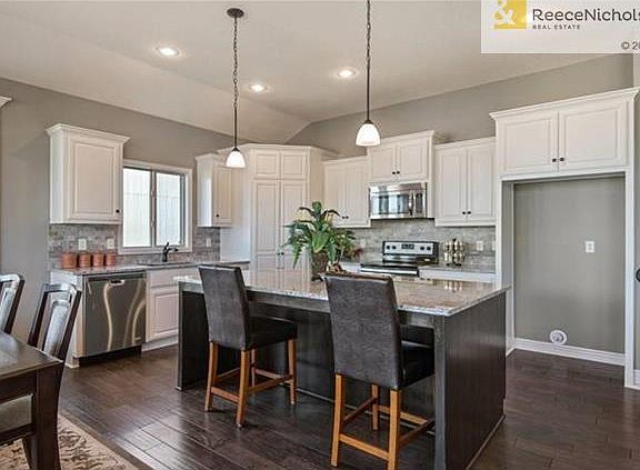 Carbondale by Award Winning Summit Homes. Brand new Ranch floor plan offers wide open living. Granite in bathrooms & kitchen. HUGE kitchen island. Finished lower level adds an extra bedroom, full bath, and family room with beautiful wet bar that has built in fridge and still has tons of storage space. 5" hand scraped hardwood floors in kitchen & dining area. Huge walk in master closet that connects to laundry. Close to nearby shopping with easy access to Hwy. Located in Award Winning Lee's Summit School District.