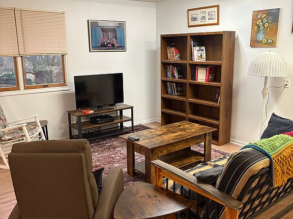 Open studio apartment with two skylights. New floor and paint. Full sized refrigerator and kitchenette. Queen size bed with bedding. Good/fair signal Wi-Fi with Amazon firestick and smart TV. Second floor walk up above two car garage (one space for renters car, plenty outdoor parking). Seasonal in ground pool (20x40) privileges. Private bath shower (no bathtub). VENMO preferred. Available for rent May 1, 2025 At least a 6 month lease to start Utilities included Two pets allowed One space inside heated garage plenty outdoor parking NO SMOKING