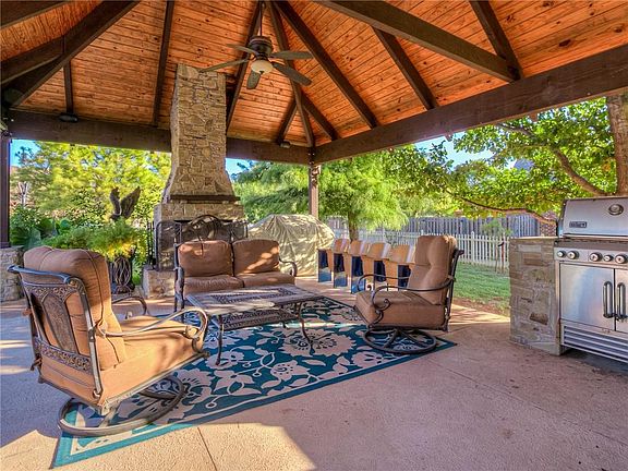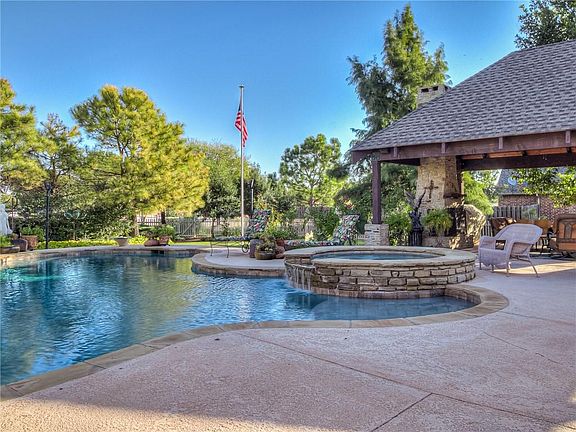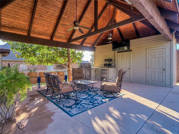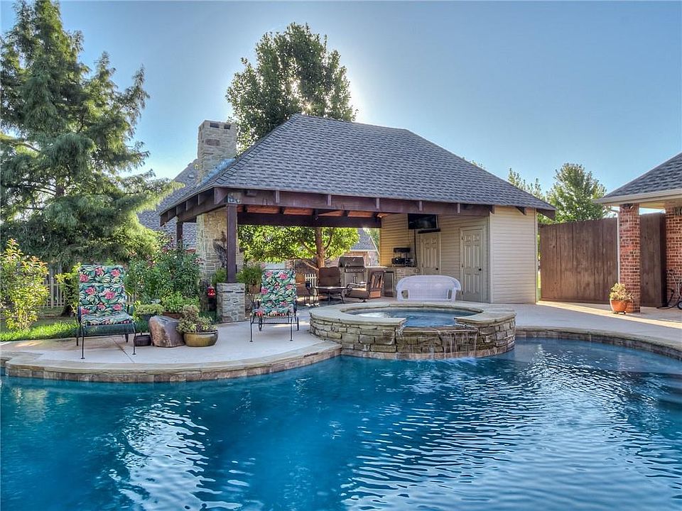 Quarantine unicorn! This house is an entertainer's dream complete with heated pool, spa, cabana, outdoor fireplace, covered patio, outdoor kitchen, lush landscaping through-out, and pool bathroom. 4 car garage for him and huge kitchen with storage galore for her. 3 beds plus study(could be 4th bedroom) and 2.5 bath. Storm shelter and added shelving in main garage with attic space over both garages. California bamboo wood flooring throughout. New air conditioner in 2018 and new hot water tank in 2020. Brand new pool pump. Large corner lot with circle drive on quiet cul-de-sac. Culligan water softener and custom blinds including electric blinds in living. Full sprinkler system. This house is truly remarkable you have to see it to believe it.
