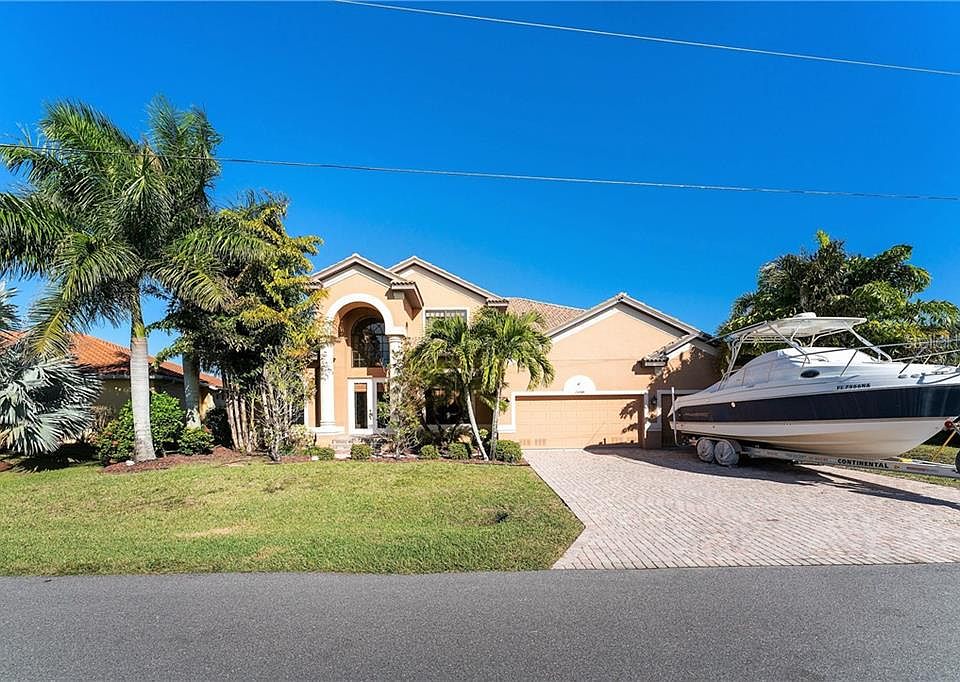 Exquisite custom built 2,980 sq. ft. 4-bedroom, 4-bathroom, pool/waterfront home located in the much sough-after South Gulf Cove neighborhood situated on 80' of waterfront on the Lakeland Waterway with access to Charlotte Harbor and the Gulf. This 2-story Benjamin Bay built home by Mercedes Homes showcases fine craftmanship and custom features throughout. The moment you arrive at this elegant home you will begin to appreciate the upgrades beginning with the stunning landscaping with outdoor lighting and paver driveway/walkway leading up to the arched entryway. Luxury glass double entry doorway opens to the formal living/dining room areas showcasing 8' tile on the diagonal throughout first floor, crown molding, vaulted ceilings, and large windows to let in the natural light. The elegantly designed kitchen has granite counter tops, center island, newer stainless-steel appliances including double oven, pantry closet, breakfast bar, 42" cabinets, dining area and overlooks the spacious family room. Sliders from both areas lead out to the pool/lanai area with great views of the waterway. Your master suite is a private oasis on the first floor featuring a sitting area with access to a secluded screened in patio area, his & her walk-in closets, dual vanities, garden tub, roman shower, and sliders out to the pool area. The space continues for your family upstairs with 3 additional over-sized bedrooms, full bathroom and an open great room that is sure to please. The "WOW" factor continues when you step out into your large screened-in lanai showcasing a sparkling swimming pool/spa, pool bath, lots of patio space for entertaining and screened lanai overlooking a wide water view of the canal. Fenced in backyard is great for your pets and small children. Home also features laundry room, attached 3 car garage, additional half bath on first floor, dual furnaces and A/C, storm panels, complete irrigation system watered by pump, tiled barrel roof and so much more. Great boating community with optional annual HOA. Community boat ramp with access to 55 miles of canals plus Charlotte Harbor. This home is located just minutes away from Englewood and Boca Grande beaches, shopping, great restaurants, entertainment and if youre a golfer, Rotonda is just around the corner, which offers 5 golf courses.
