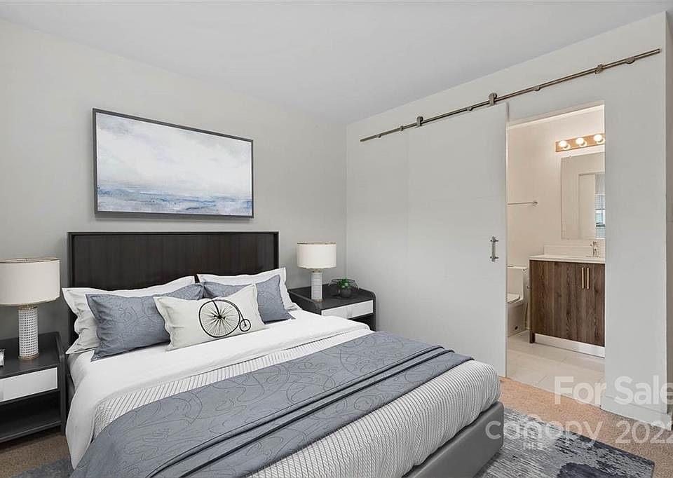 Duet style Modern Farmhouse townhome in the Commonwealth neighborhood of Midwood Place! Proposed future expansion of City Lynx Gold line with a stop at Briar Creek!!! Open floor plan includes two primary bedrooms with on-suite bathrooms and half bathroom downstairs for guests. Primary bedroom has custom closet shelving, bath features barn door and frameless glass shower with modern tile. Entire townhome features ample European style cabinetry throughout, white quartz counters, and stainless steel appliances. Oversized island and additional dining area. Living room features wood burning fireplace wrapped in shiplap. Luxury vinyl plank floors can be found downstairs and plush carpet in the upstairs bedrooms. Fully fenced backyard features a patio for cookouts and grass backyard. Nest thermostat. Located minutes from Independence Highway entrance and an easy commute to Uptown. Each unit includes 2 parking spaces and a shared guest parking spot per duet. Fridge to convey!
