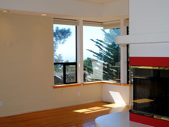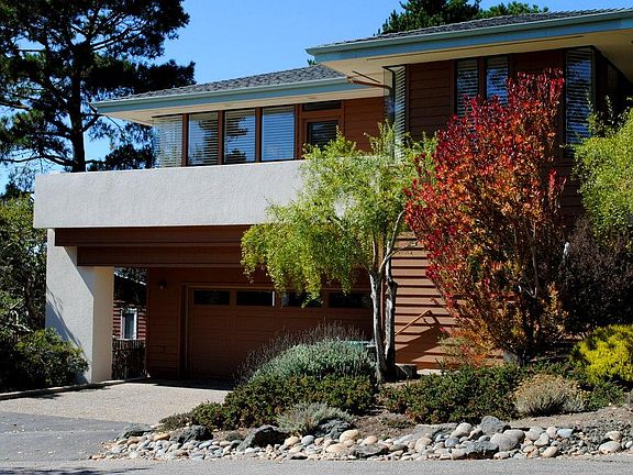 Live peacefully, in the hills of Cambria, south of Hwy 1 in a quiet wooded surrounding with Schindler inspired architecture and amazing ocean views. 3/4 miles away from Fiscalini Ranch Preserve open space and trails. This home is rich in detail with a completely remodeled kitchen with 6 burner Viking cooktop, Wolf Exhaust, dual oven, custom maple cabinetry, granite countertops with beautiful bronze backsplash, oversized walk in pantry and Terrazzo tile flooring with a traditional sized dining room directly off of the kitchen. Gracious sized living room featuring several windows to experience a view like no other while cozying up to the gas fireplace. Screened door at exterior deck lets the sun and fresh breeze in. Master bedroom is located on main floor with built in cabinetry, dual closets and en suite. Master bath is enhanced with marble countertops and flooring, glass brick divider, maple cabinets and additional built in storage, oversized shower, separate soaking tub and lavish sconce lighting. Two additional bedrooms located downstairs which are divided by a secondary living space with ground level entrance. Bonus hobby room/studio is adjacent to the north downstairs bedroom. Wide corner lot with eye appeal and a professionally landscaped natural surrounding in this unique setting. This home has everything you desire and more.