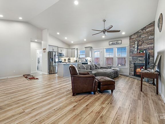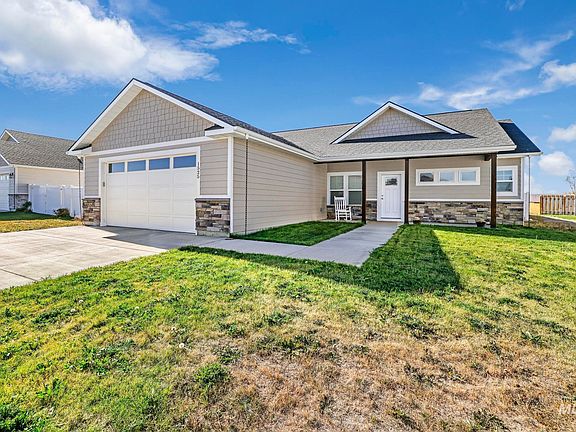 Fall in love with this 3-bedroom, 2-bath Mountain View Estates gem, built in 2023! With a smart split floor plan and 1,509 sq. ft. of beautifully designed space, this single-level beauty greets you with a cozy covered front porch—perfect for morning coffee. Inside, vaulted ceilings and a stunning floor-to-ceiling stone fireplace enhance the bright, open living and dining areas. The kitchen is a chef's dream with custom soft-close cabinets, a center island, and stainless appliances—perfect for cooking and entertaining. The spacious master suite offers a private retreat with a coffered ceiling, luxurious en suite, and walk-in closet. Out back, the covered patio is ideal for hosting or enjoying breathtaking Idaho sunsets. Plus, no flood insurance required, and your own individual well! Don't wait—schedule your showing and make this incredible home yours!